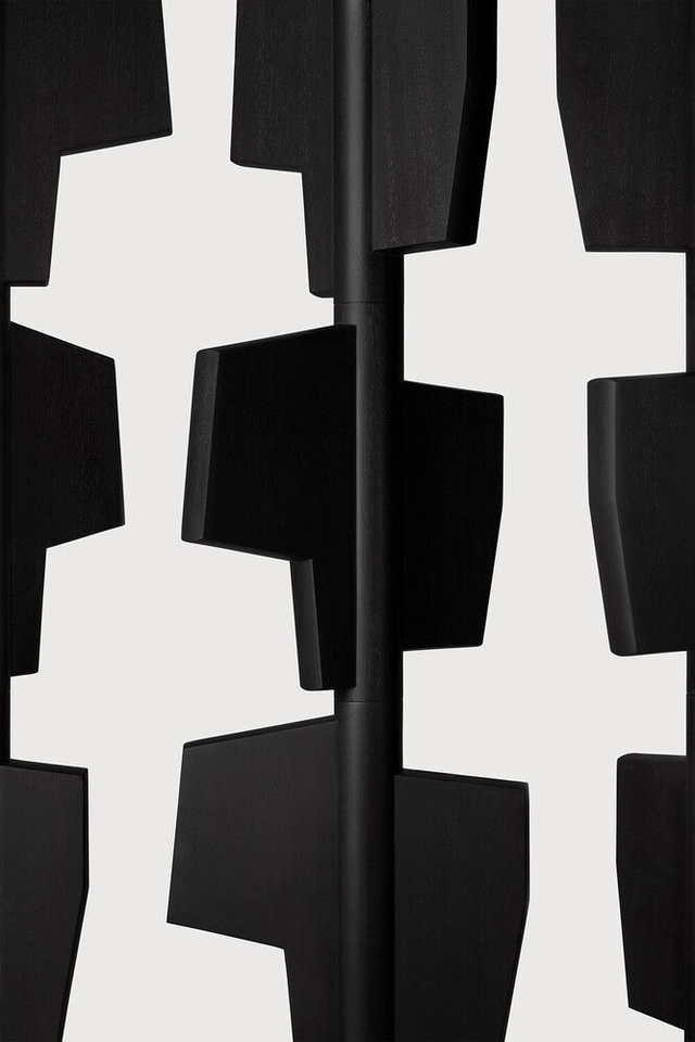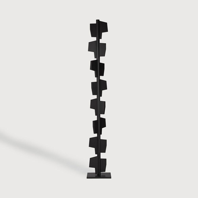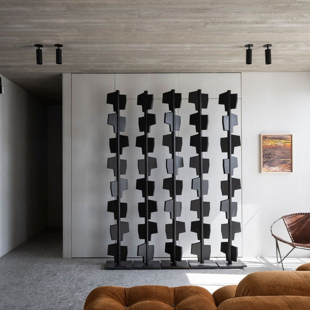 Dieser Raumteiler ist aus Holzmodulen gefertigt, die über eine patinierte Stahlstange und einen Sockel gleiten. Es ist ein gleichermaßen skulpturales wie funktionales Kunstwerk. Ein komplettes Claustra besteht aus fünf oder mehr Totems, abhängig von euren Bedürfnissen und den räumlichen Gegebenheiten.